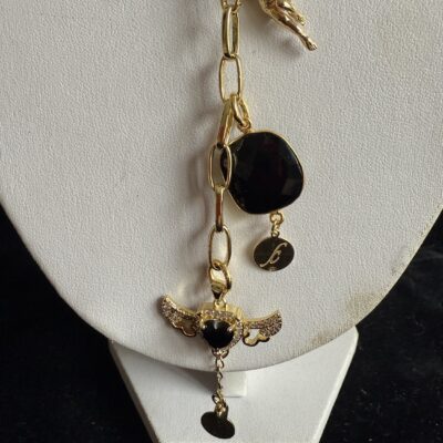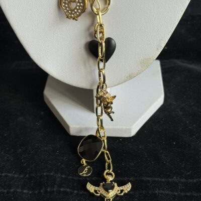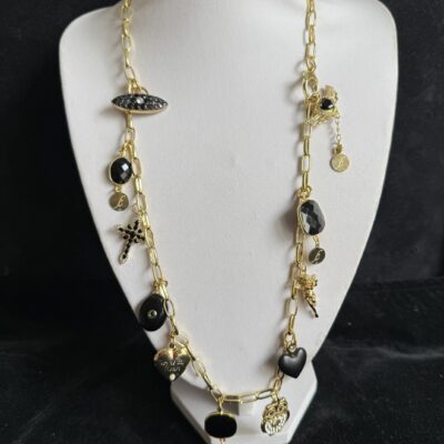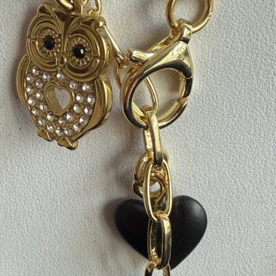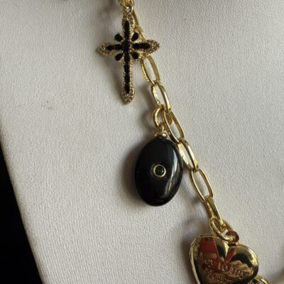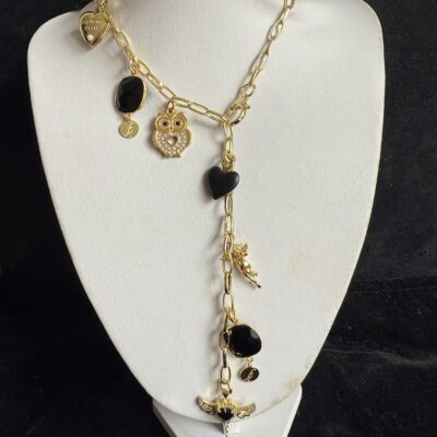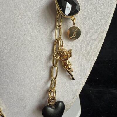 Pendenti charms con zirconi e smaltati: cuori smaltati neri, gufo argento sterling con zirconi, angioletto placcato 18 kt, croce con zirconi, 3 pietre di onice con medaglietta FC arg. 925 dorato