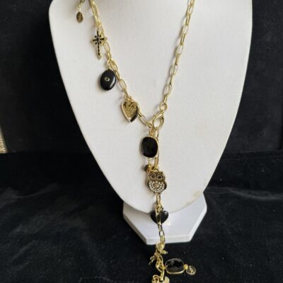 Pendenti charms con zirconi e smaltati: cuori smaltati neri, gufo argento sterling con zirconi, angioletto placcato 18 kt, croce con zirconi, 3 pietre di onice con medaglietta FC arg. 925 dorato