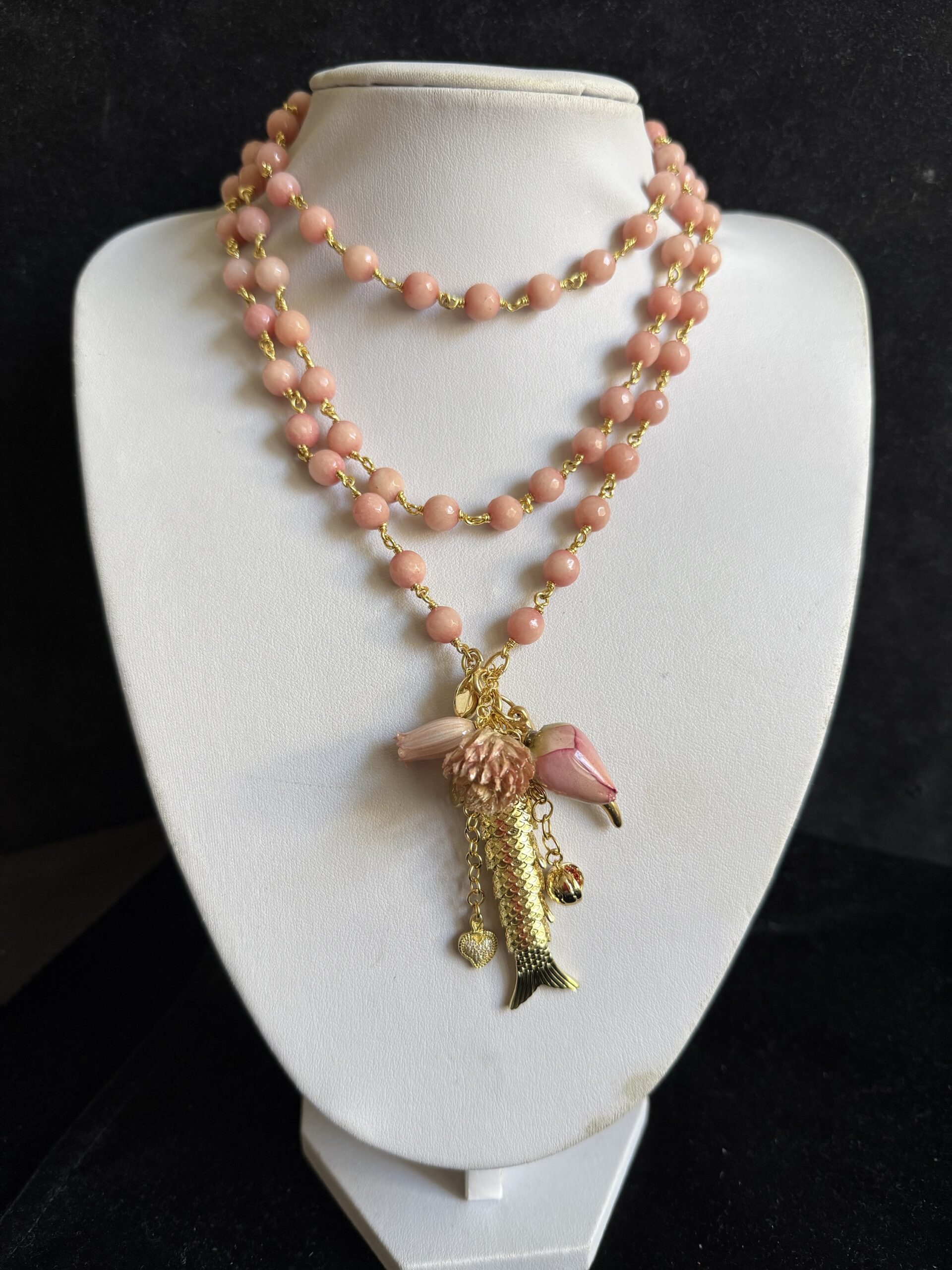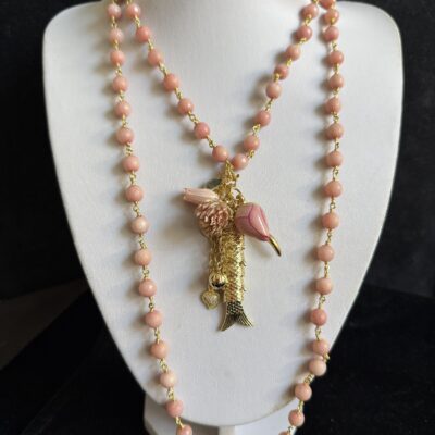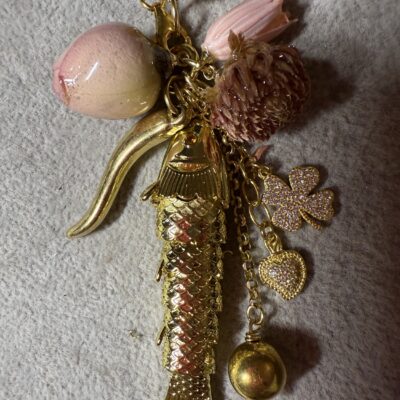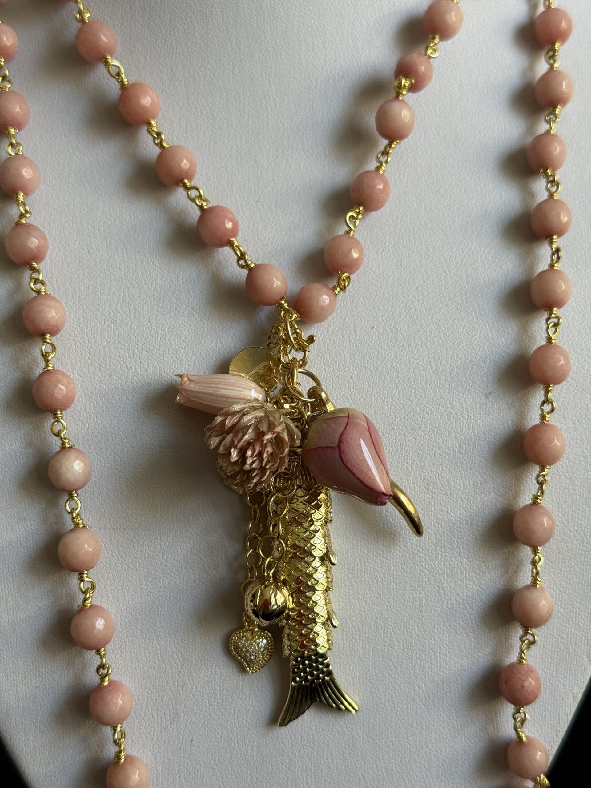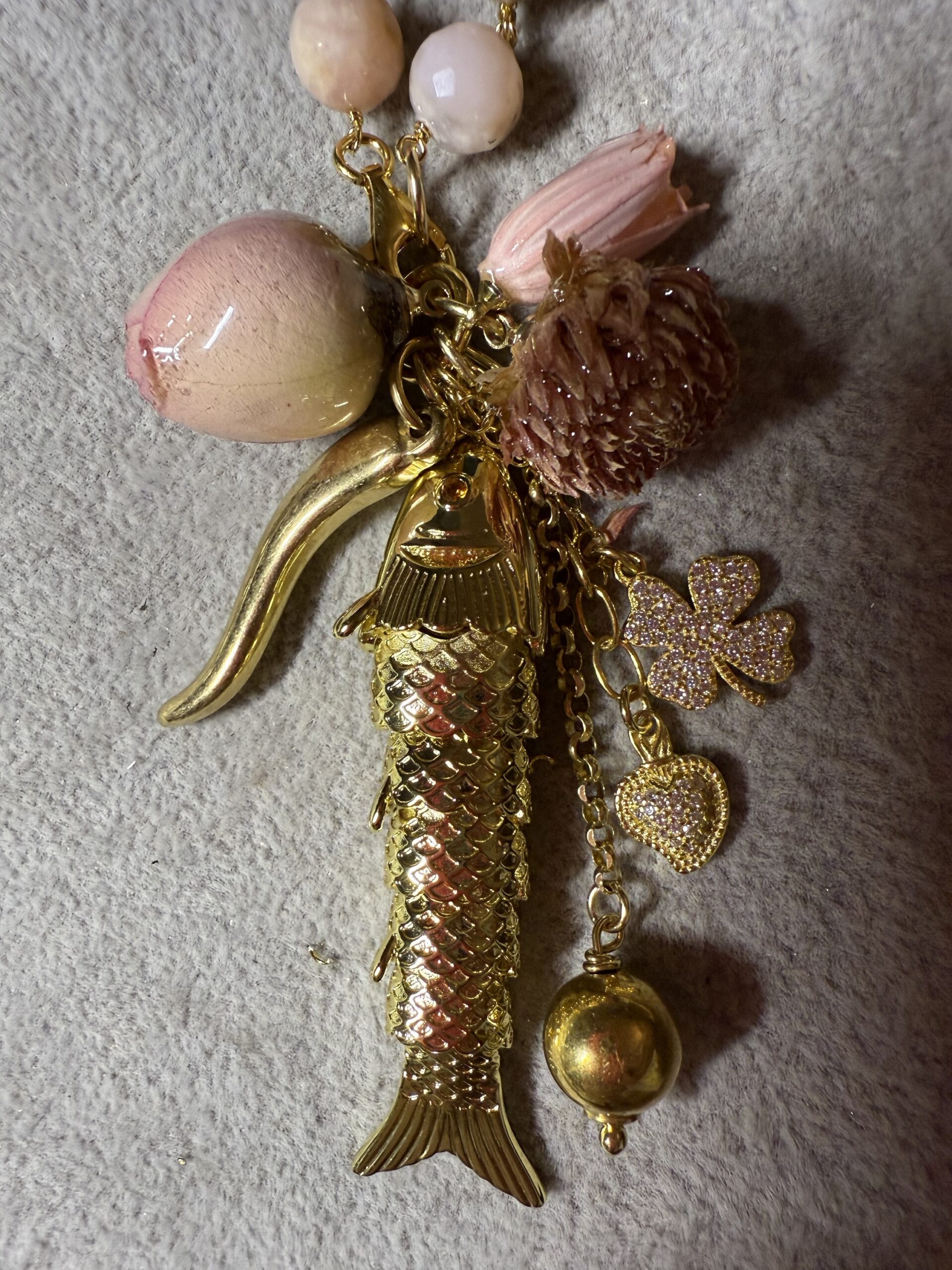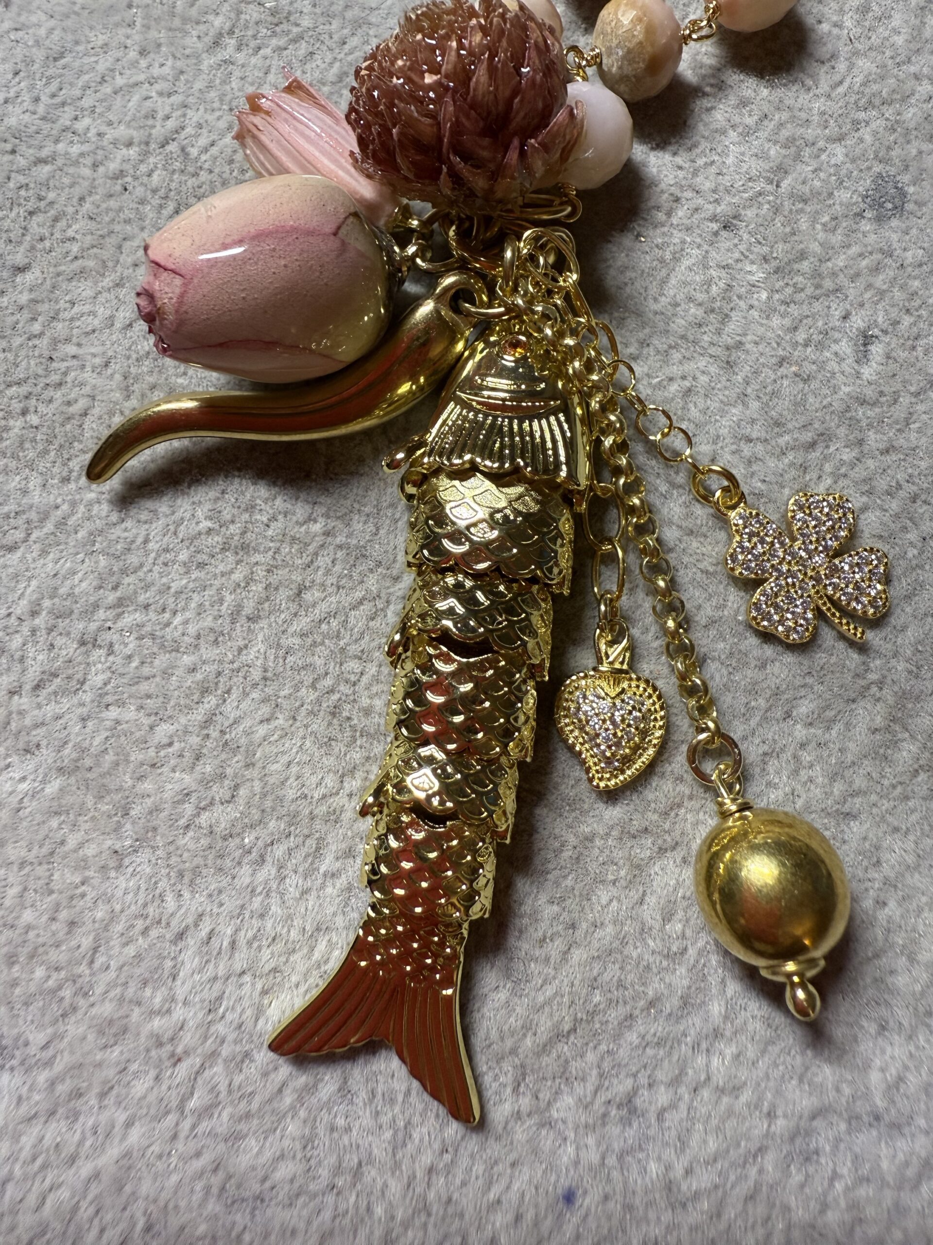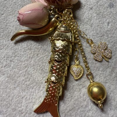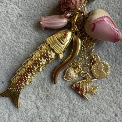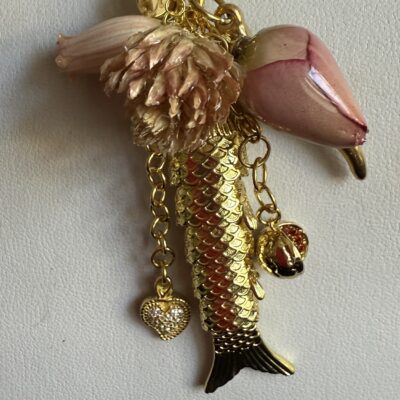 Chiusura finale con ciuffo rimovibile di fiori e charms argento 925 dorato e pesce snodabile ottone dorato