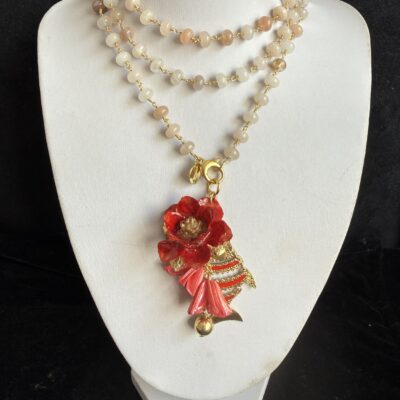 Collana lunga lavorata a mano con argento dorato e sfere mm 8 di pietra di luna chiara