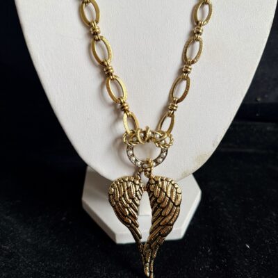 Pendente con cerchio con perline e ciondolo a forma di ala d’angelo con forza alata in bronzo dorato:
