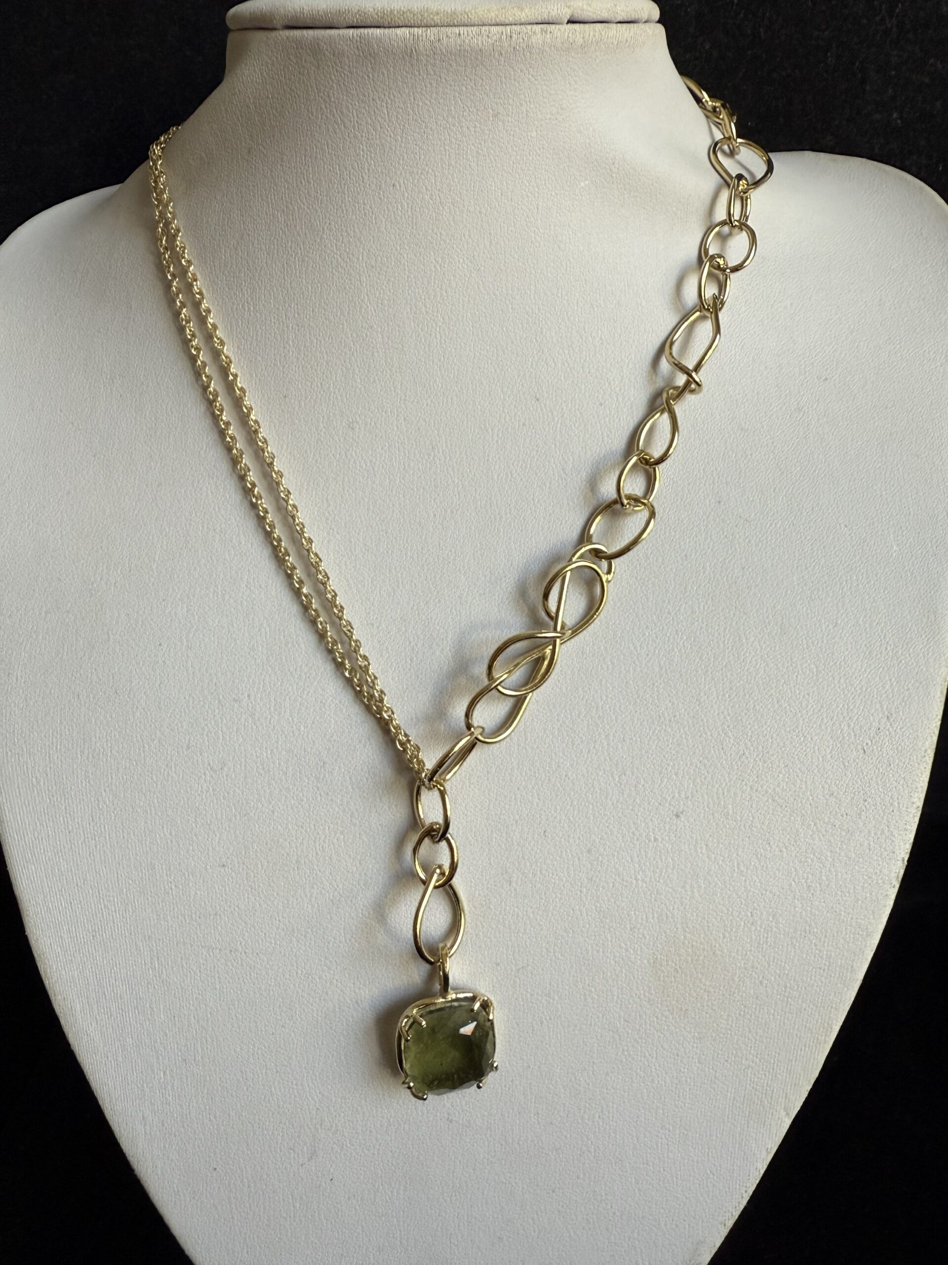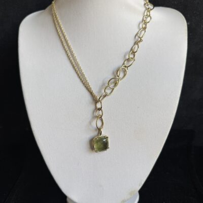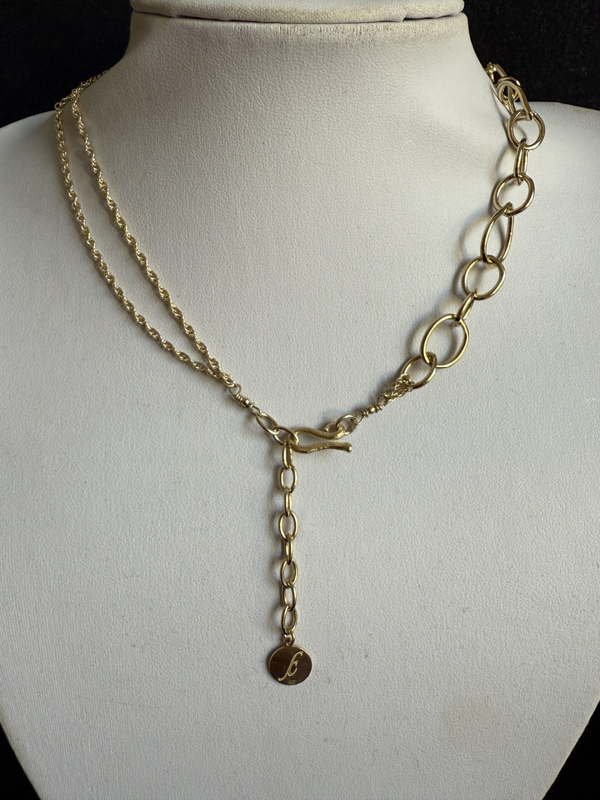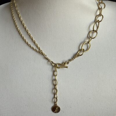 Collana girocollo lavorato a mano con catena cerchi fantasia in argento 925 dorato, e catena doppio torchon in argento 925 dorato