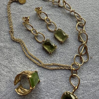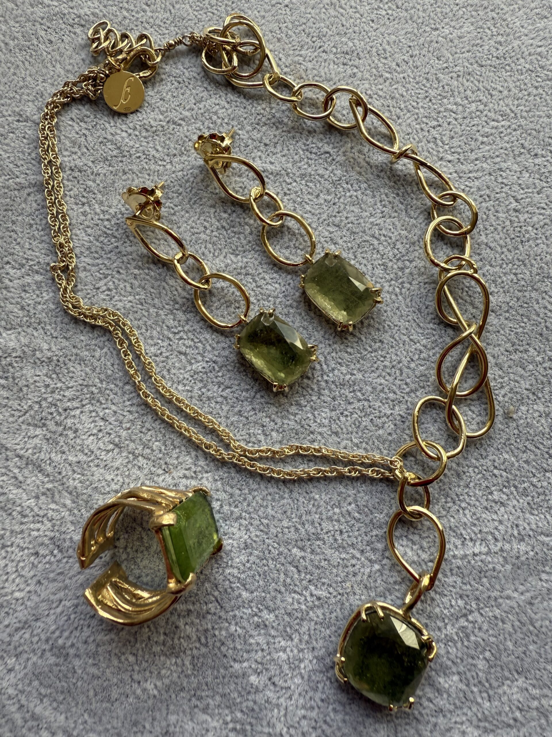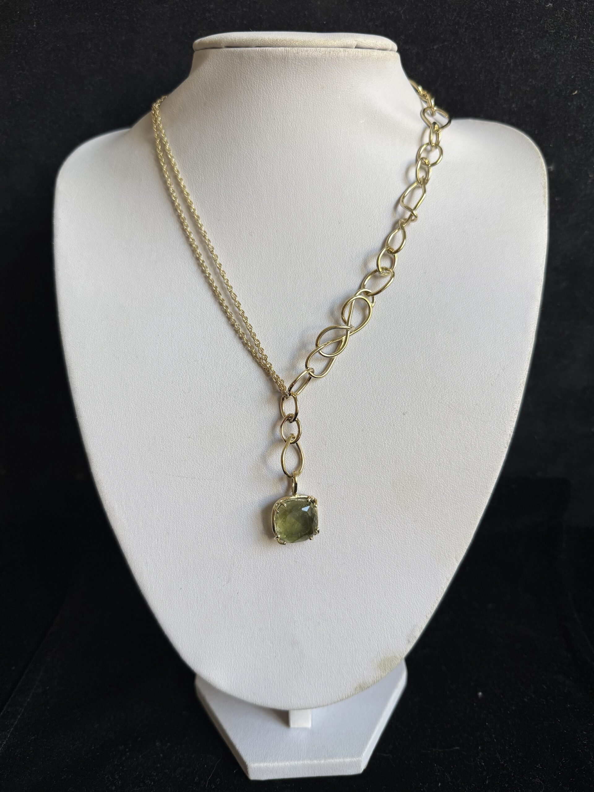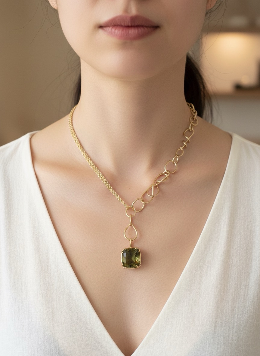 Collana girocollo lavorato a mano con catena cerchi fantasia in argento 925 dorato, e catena doppio torchon in argento 925 dorato