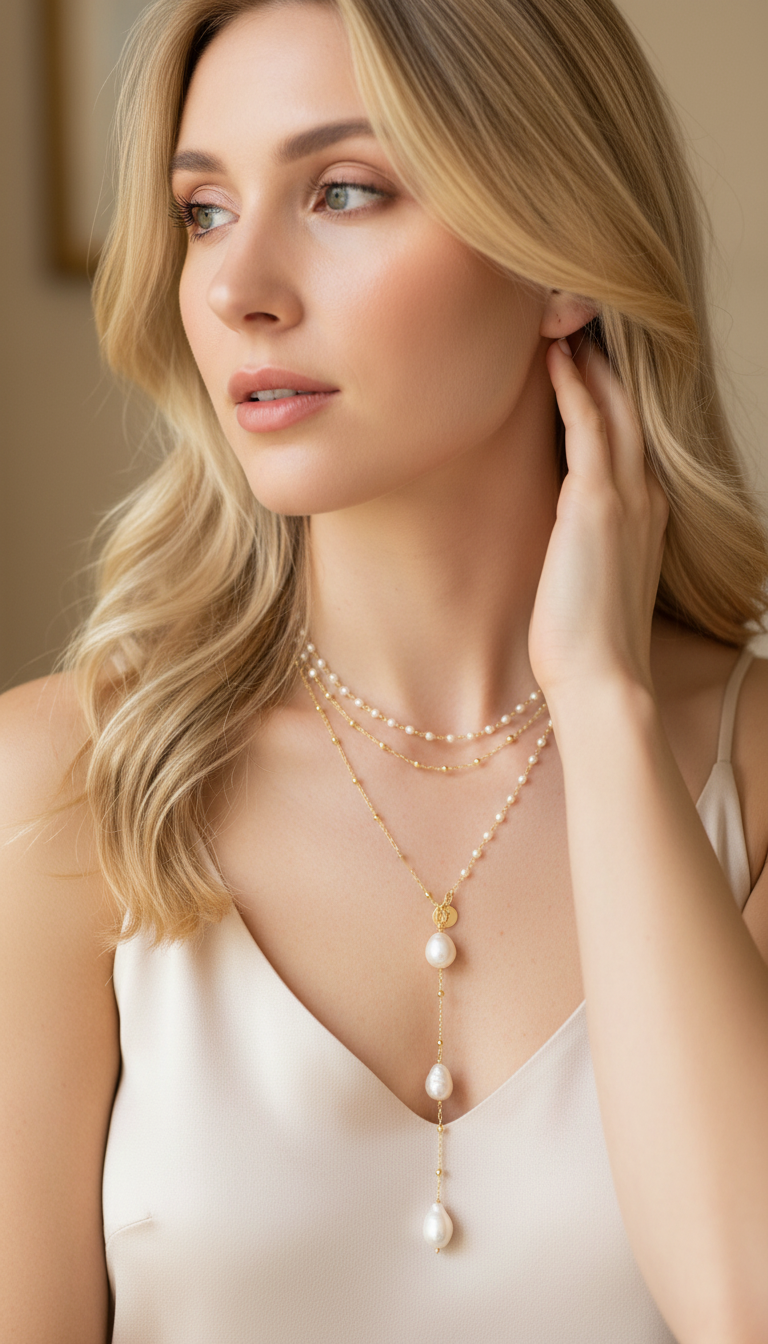 Collana lunga lavorata a mano con argento 925 dorato e perle di fiume