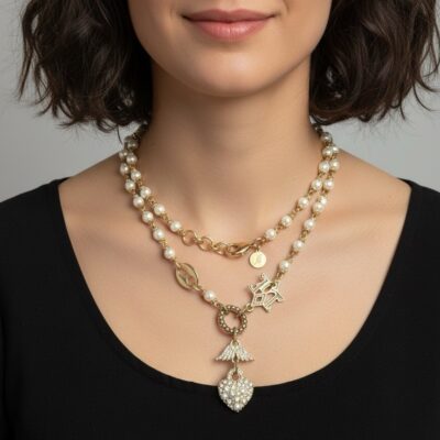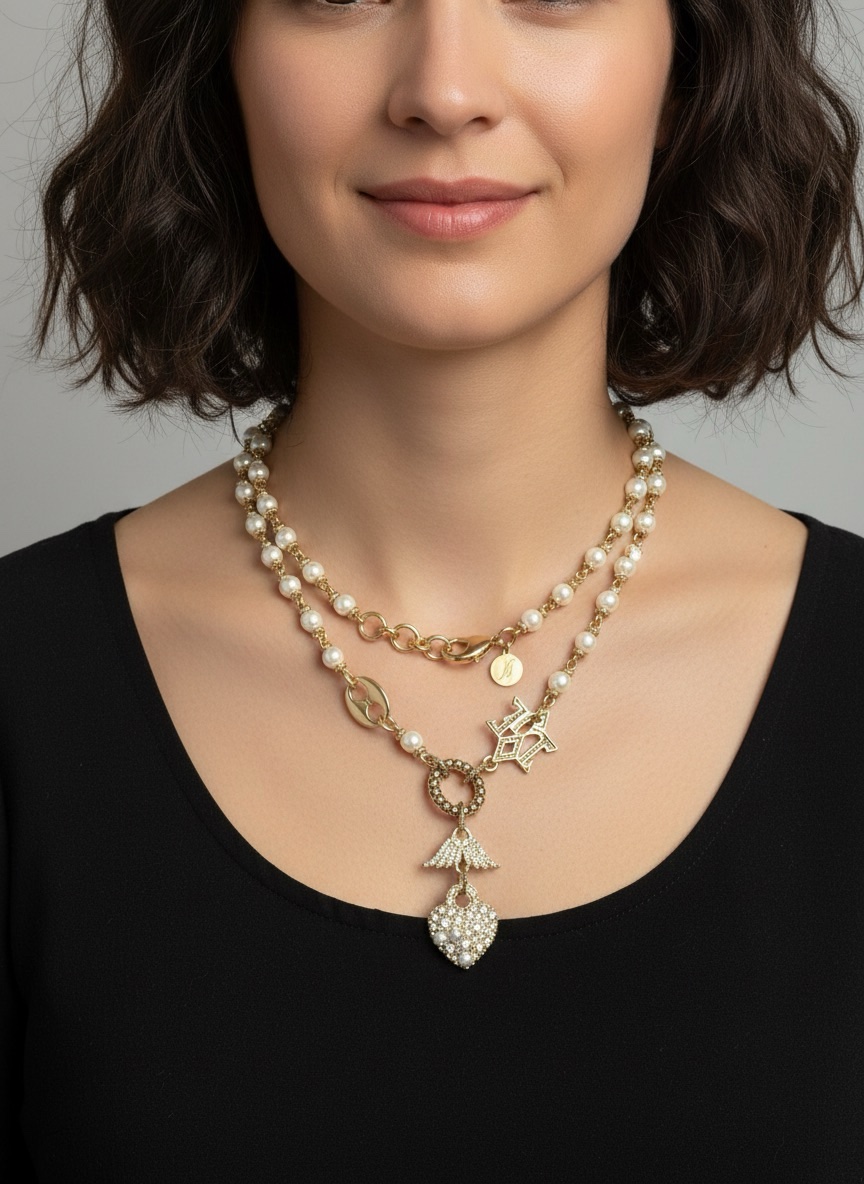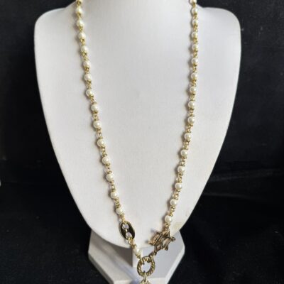 Collana lavorata a mano con perle di Maiorca e intervalli in ottone dorato