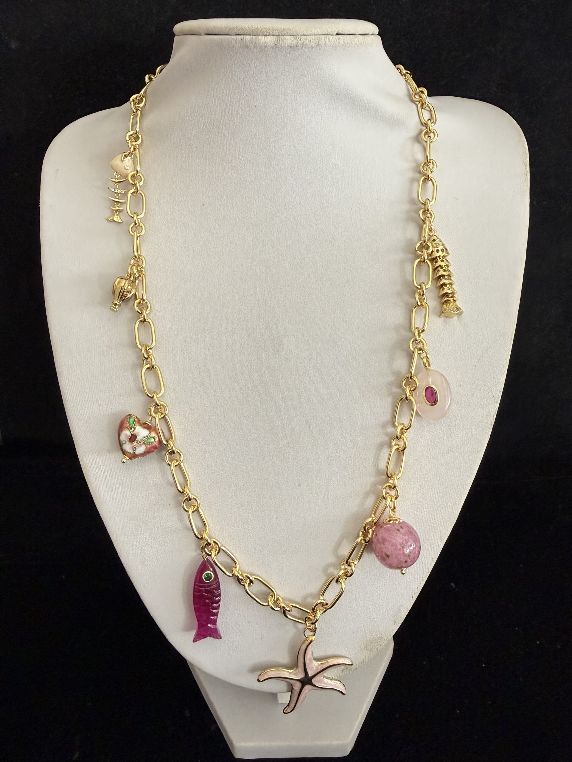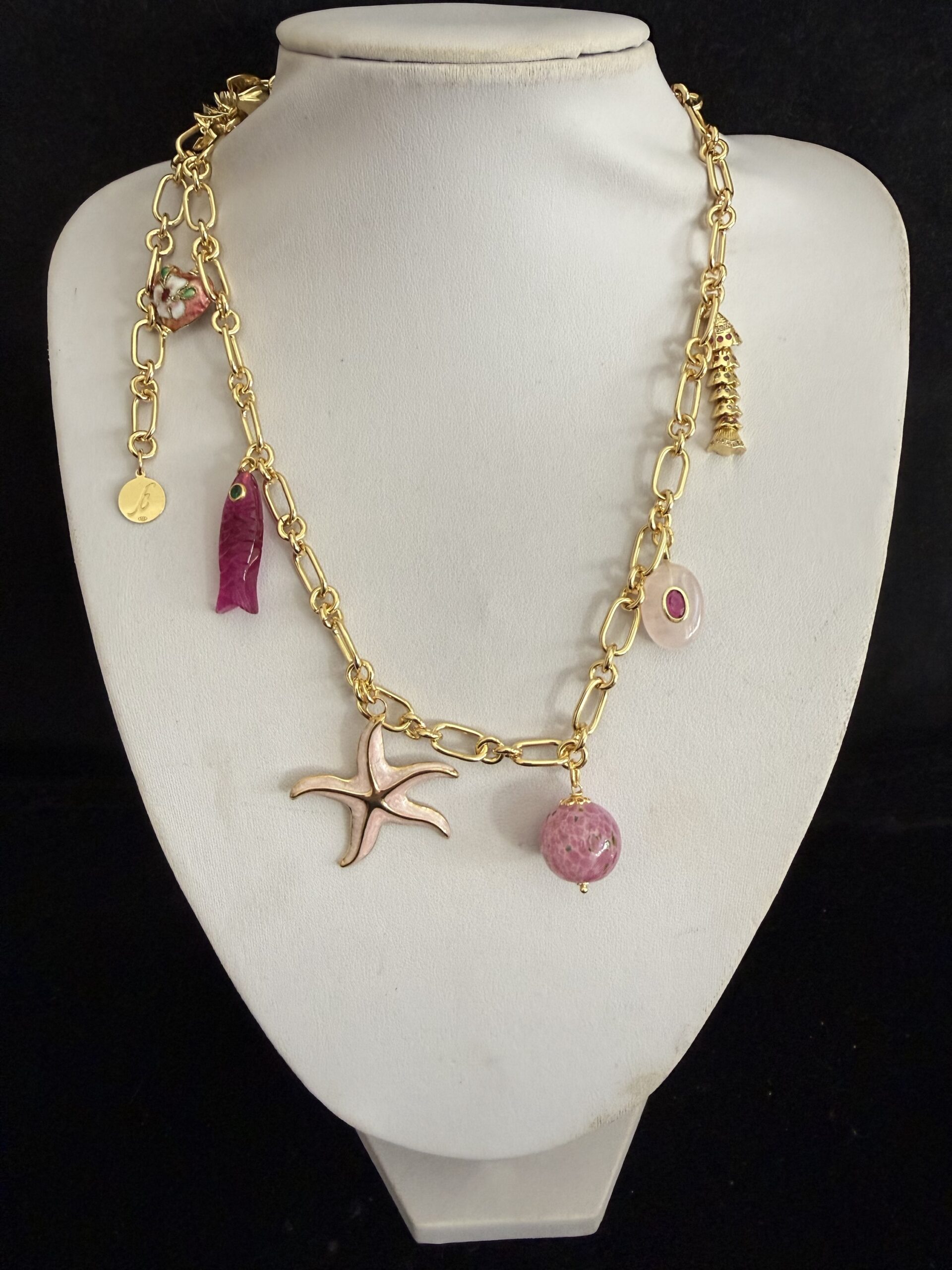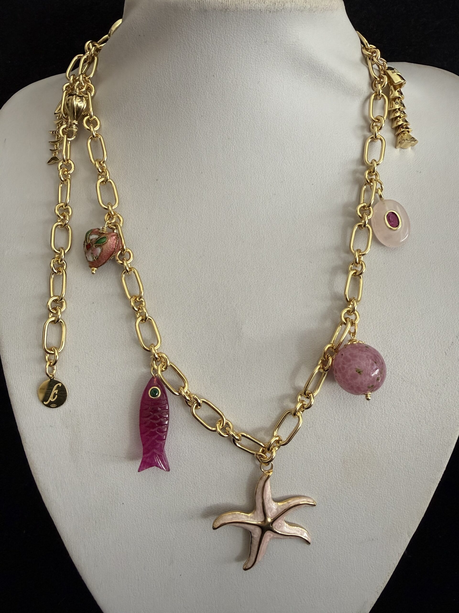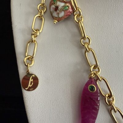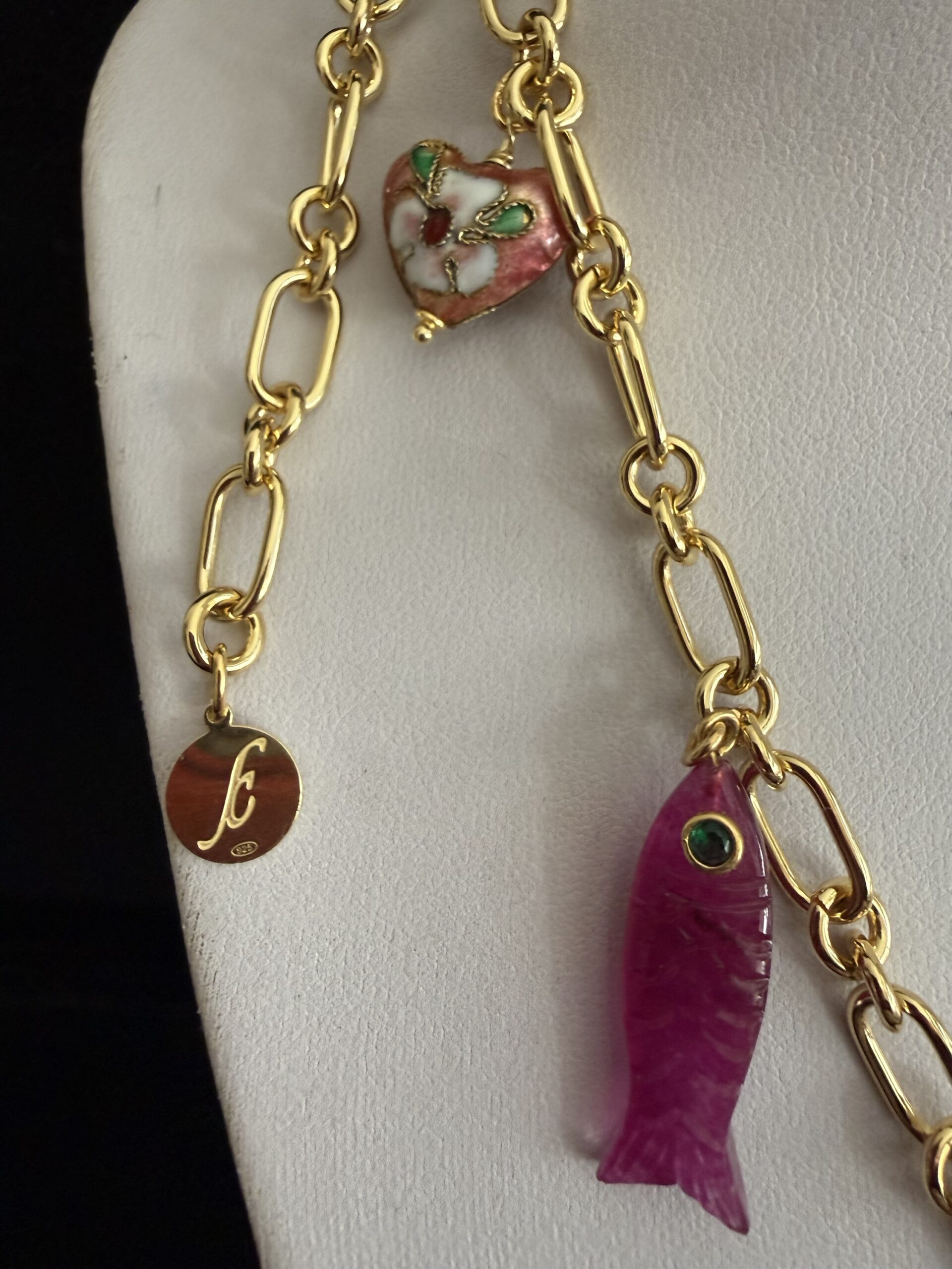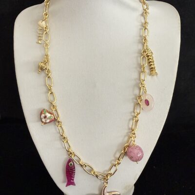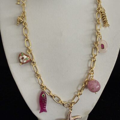 8 Pendenti fra cui pesci e charms dorati smaltati e lavorati a mano:
