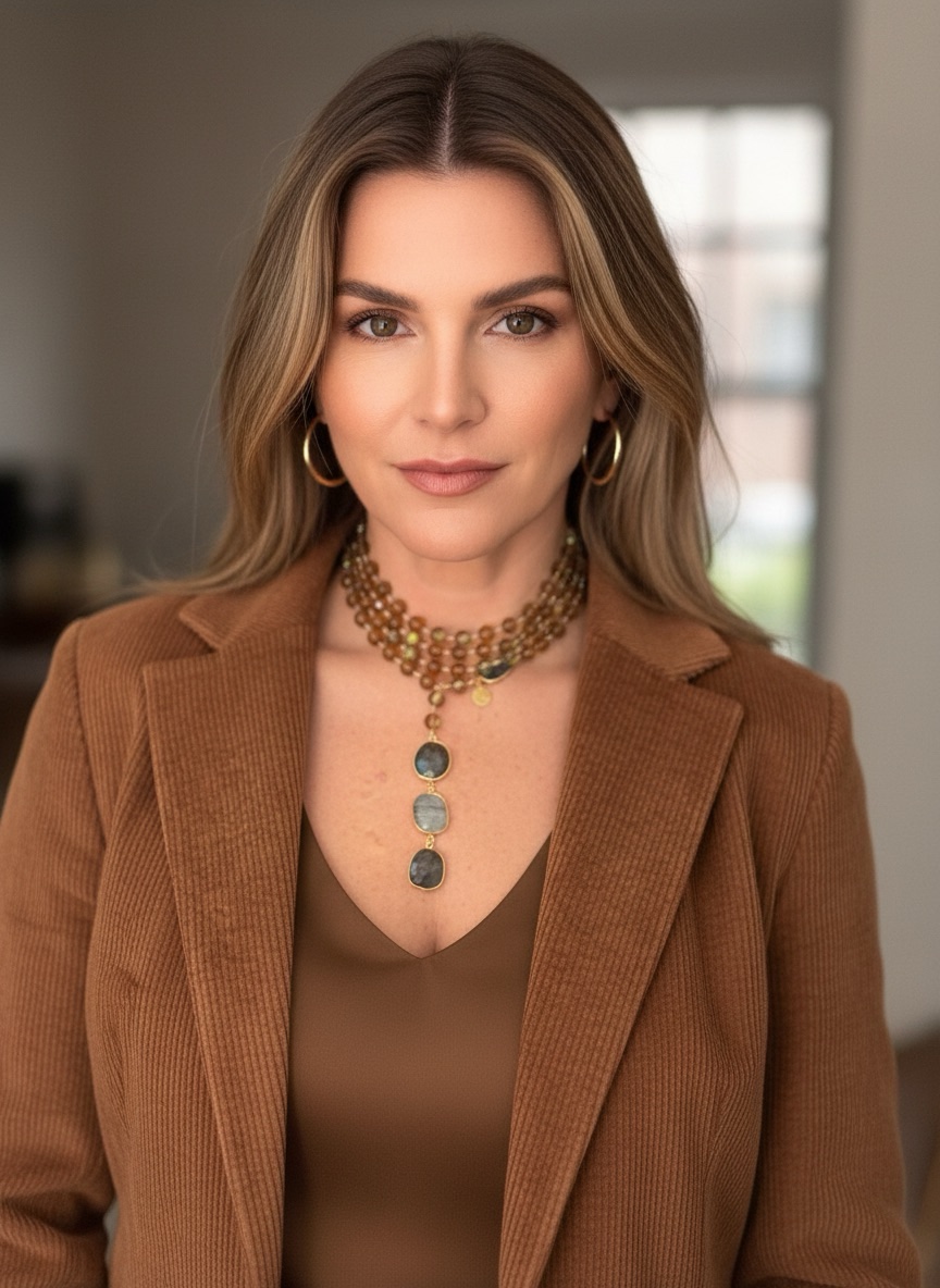 Collana lunga lavorata a mano con pietra di luna color cognac mm 8 e argento dorato