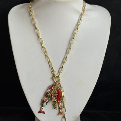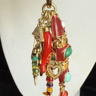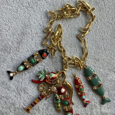 3 pesci snodabili smaltati in ottone dorato, cornetto smalto rosso.