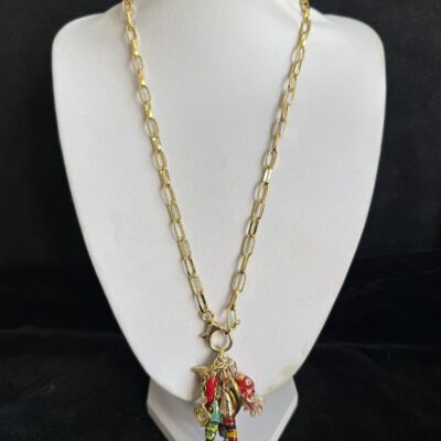 3 pesci snodabili smaltati in ottone dorato, cornetto smalto rosso.